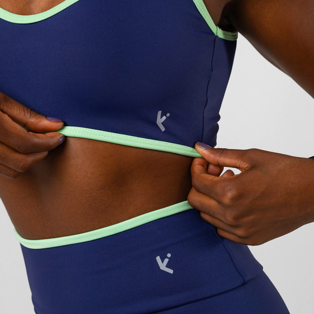 O Top Dual Fit apresenta design anatômico e acabamento contrastante que valoriza a silhueta com sustentação e elegância.
